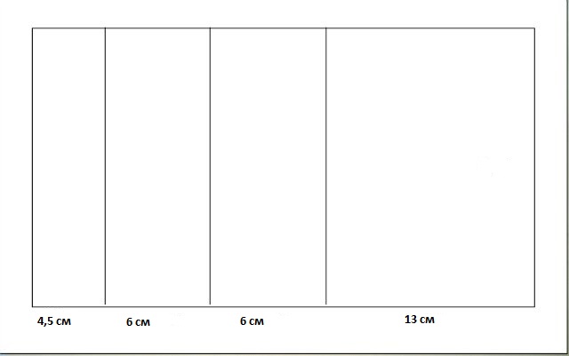 Берем нашу плотную акварельную бумагу под основу и расчерчиваем ее на несколько частей. Отмечаем 1 прямоугольник шириной 4,5 см, два прямоугольника по 6 см., и один 13 см.