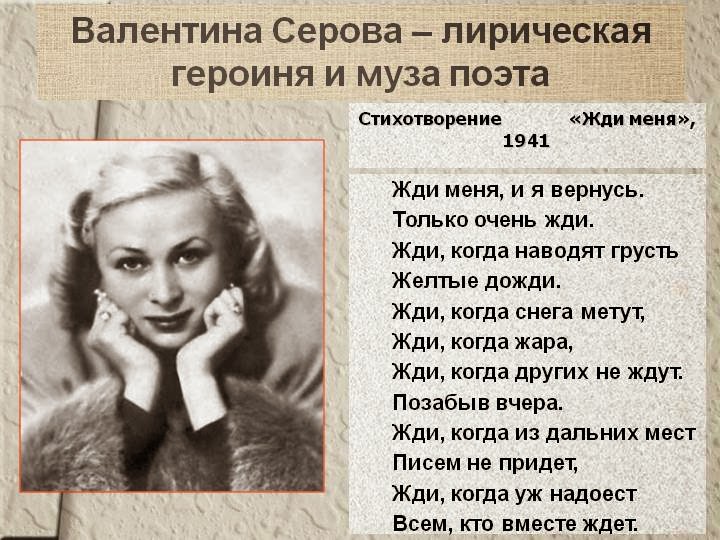 Валентина Серова сыграла главную роль в одноименном фильме «Жди меня», который был снят по сценарию Симонова режиссером Александром Столпером в 1943-м на Центральной объединенной киностудии в Алма-Ате.