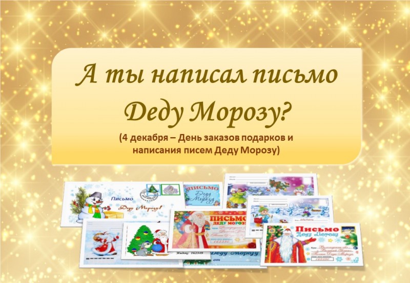 4). 4 декабря - День заказов подарков и написания писем Деду Морозу– [Источник: http://территория19.рф/pozdravleniya/21-pozdravlenie-ot-territorii/3408-4-dekabrya-den-zakazov-podarkov-i-napisaniya-pisem-dedu-morozu.html]