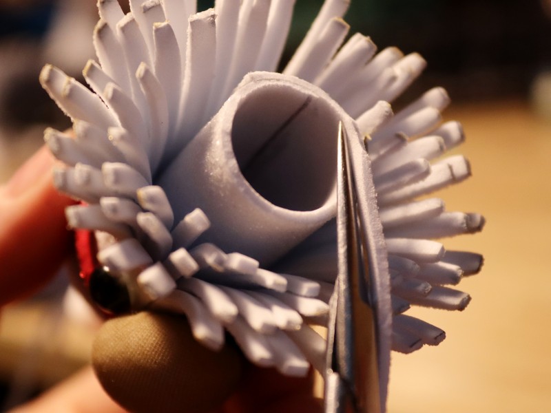 5. Наматываем полоску с надрезами на рулончик, нанося клей на верхнюю часть рулончика, и фиксируем.