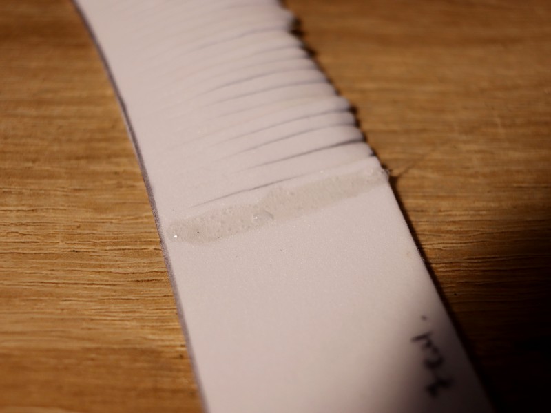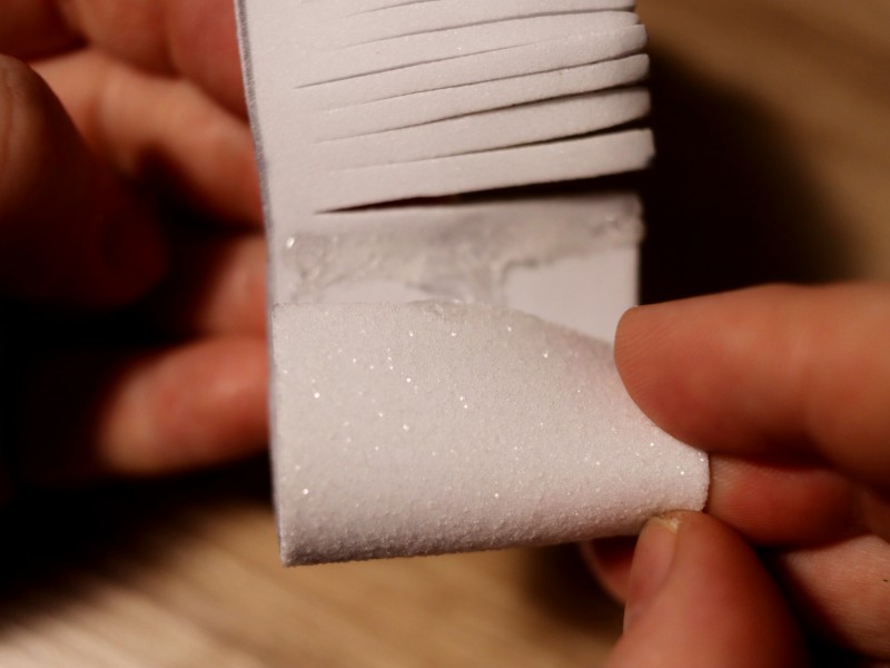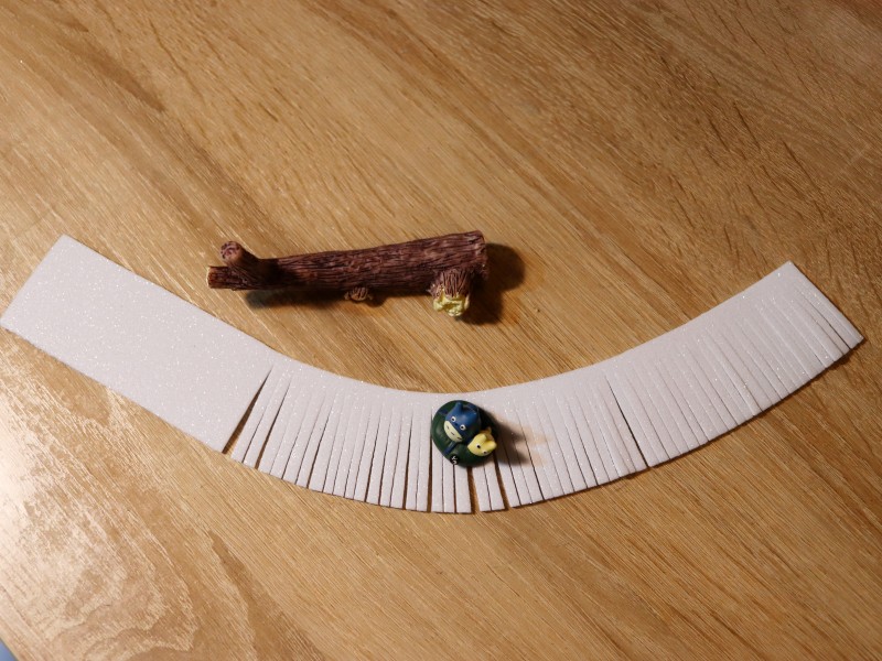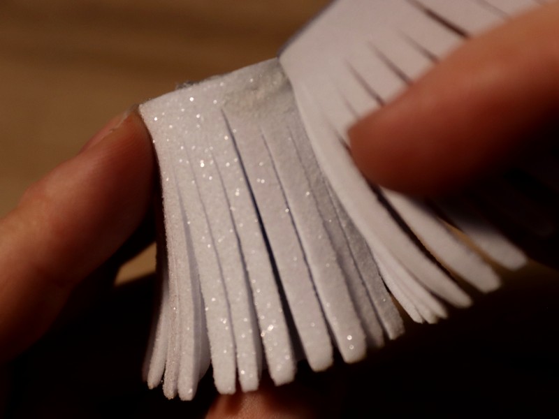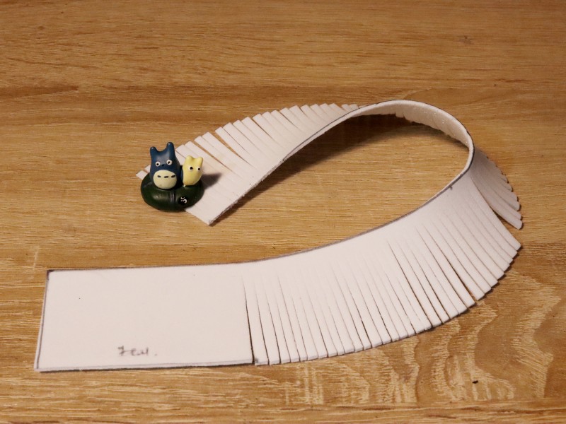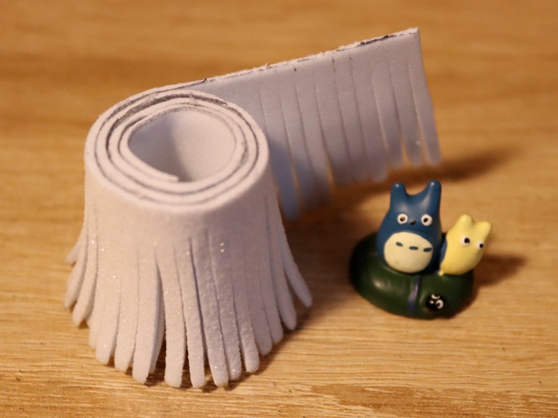 Берем полоску из белого фоамирама и делаем надрезы по всей ее длине примерно по 2-3 мм. Надрезы делаем не до конца, чтобы не отрезать лишнего. С одного края полоски оставляем 7 см. без надрезов. Это необходимо для склеивания нашей заготовки.