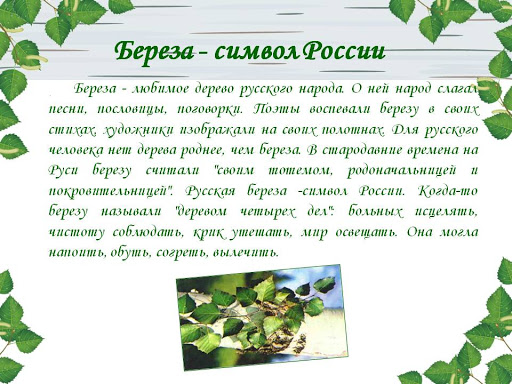 Особое пристрастие русских к березе живо до сих пор. Это дерево с яркой листвой, нежным свежим запахом и белым в черных крапинках стволом считается в России эталоном растительной красоты. Постепенно береза превратилась в растительную эмблему русских, что нашло отражение во многих народных и авторских песнях, в стихотворениях, кинофильмах , в массовой культуре.