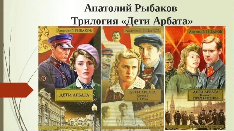 Самая знаменитая серия Рыбакова «Дети Арбата» включает в себя три произведения: "Дети Арбата", "Страх или 35 и другие годы", "Огонь и пепел". Дети Арбата" книга автобиографическая и многие моменты из романа упоминаются в автобиографии писателя. В конце 80-х - в начале 90-х книга была настоящей "бомбой". Рыбаков довольно мастерски показывает атмосферу всеобщего страха, поголовного доносительства, беспросветного будущего, хотя сам, имея судимость на фронте до майора дослужился, и писателем стал, и даже Сталинскую премию получил.