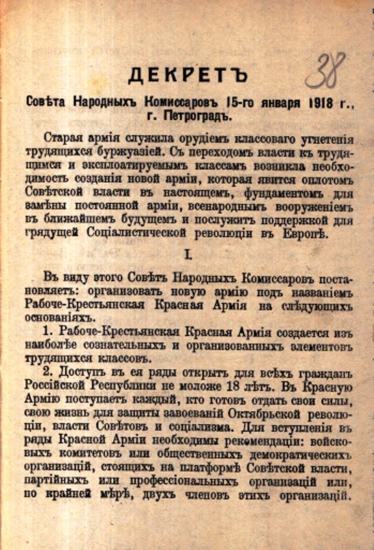 Создаваемые еще до Октябрьской революции отряды Красной гвардии из рабочих и революционных матросов не могли противостоять отлаженной военной машине Германии. И 15 (28) января Совет народных комиссаров России издал Декрет о создании Рабоче-крестьянской Красной армии.