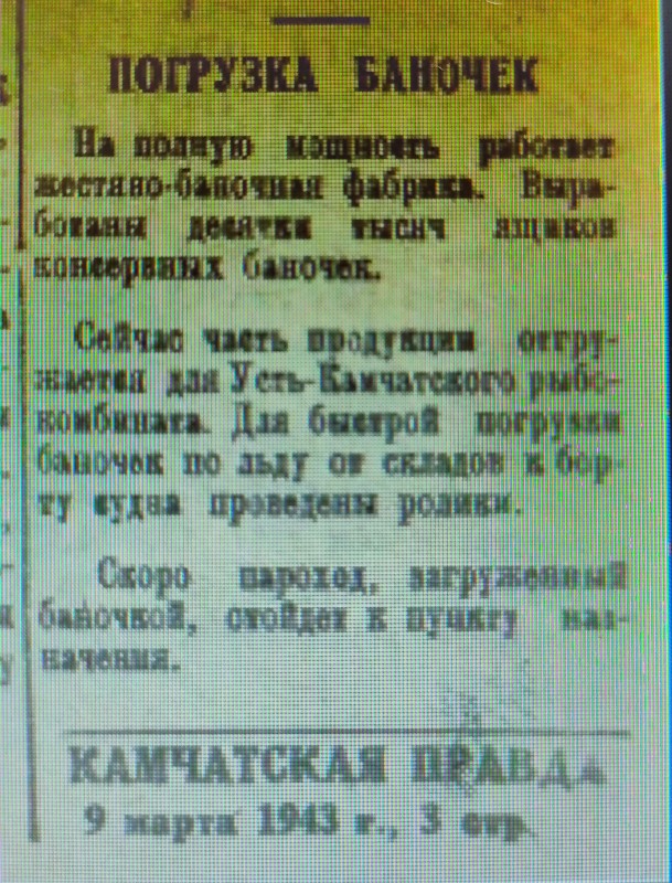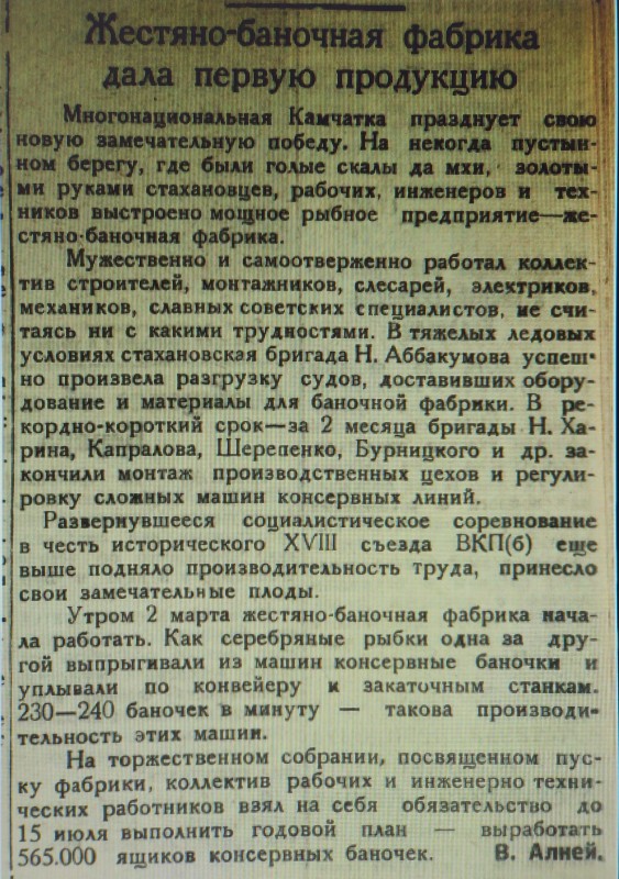 За годы своего существования фабрика переживала и взлеты, и падения, но начнем сначала. Территория, на которой была построена фабрика представляла собой пустырь, заросший кустарником, с неподступным ландшафтом, низко надвигающимися сопками. Дорог вообще не было. Практически ручной труд лег в основание и разработку территории будущей фабрики: кирка, лопата и …вера. Вдохновленные энтузиазмом тех времен, люди практически на своих плечах ввели в строй первую очередь фабрики – это произошло в 1936 году. Необходимость в собственной жестяно-баночной фабрике была велика. Рыбная промышленность бурно развивалась, появлялись новые рыбоперерабатывающие заводы, в те годы их было 45. И банкотарой их обеспечивал г. Владивосток. Но из-за недостаточного количества транспорта такое производственное сотрудничество было экономически невыгодным. Поэтому вскоре было принято решение перевести владивостокскую жестяно-баночную фабрику на Камчатку. Два года ушло на демонтаж оборудования во Владивостоке. В 1938 году вместе с мастерами и рабочими фабрика зажила на новом месте, это было полноценное предприятие со своим заводоуправлением.