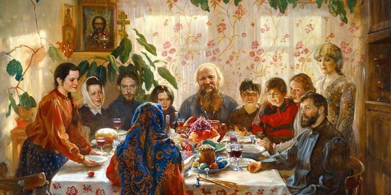 Праздник Пасхи-, как правило, семейная трапеза, без гостей. Стол покрывают белой скатертью, на столе крашеные яйца, высокий хлеб из сдобного теста - кулич, и сладкое блюдо из творога с изюмом - пасха, которые освящены в церкви в Страстную субботу.