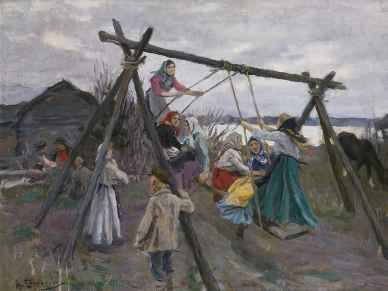 Традиционным пасхальным развлечением были качели для детей. Строили и общественные качели: на центральной площади вкапывали столбы, вешали веревки, прикрепляли доски. Девушки, качаясь с парнями, пели: