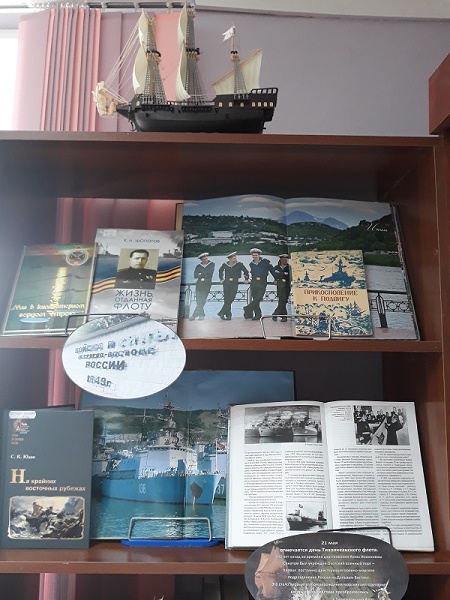 Истории становления Тихоокеанского флота, его структуре, классам боевых кораблей и основам кораблевождения посвящена книжно-иллюстративная выставка «Краеведческий календарь: юбилей Тихоокеанского флота», которая продолжает свою работу в библиотеке №5.