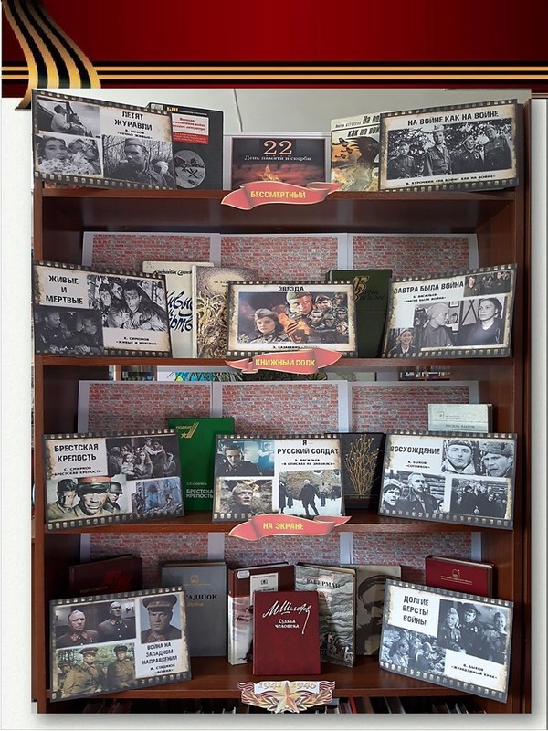 На книжной выставке «Бессмертный книжный полк на экране» представлена художественная литература о войне: произведения, ставшие основой для лучших советских и российских фильмов. Большинство этих кинолент было снято по мотивам книг, которые, как правило, гораздо точнее и глубже раскрывают сюжет и замысел автора.