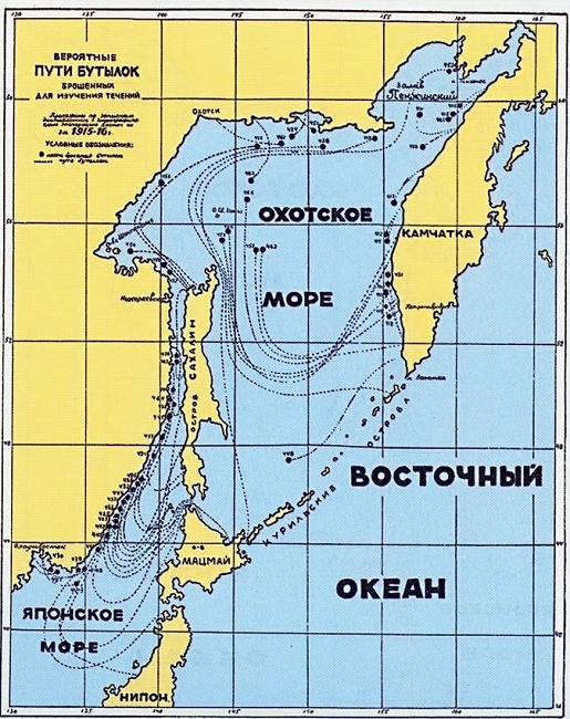 В 1913 г. наблюдения над течениями в северной части Охотского моря производились с транспорта «Охотск» вертушкой Экмана (на якорных стоянках) или «обыкновенным прибором из банки и ведра». На переходах с транспорта и военными судами было выброшено 1258 бутылок с записками, в 1915 г. - 316.