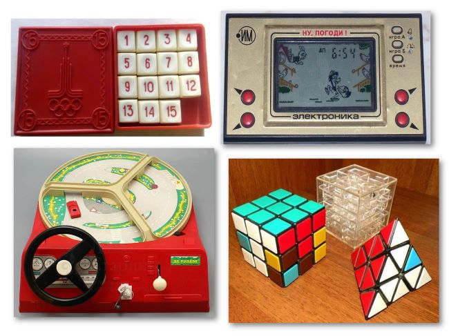 А еще было много интересных и увлекательных игр: электронные «За рулем», «Ну, погоди!»; головоломки «Змейка», «Пятнашки», головоломки-лабиринты. Но первое место по популярности принадлежало кубику Рубика, которым весь мир заболел в начале 1980-х годов. Если верить статистике, тогда головоломку крутил каждый пятый житель Земли! С 1982 года проводятся чемпионаты мира по собиранию кубика.