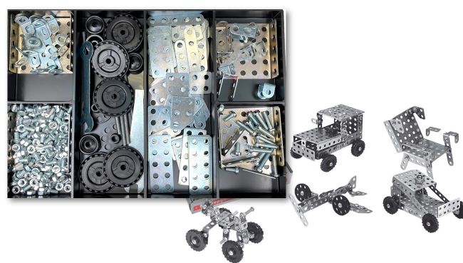 Самым популярным советским конструктором стал металлический. Его прототипом выступил изобретенный британским инженером Фрэнком Хорнби в 1901 году конструктор под названием «Meccano». В СССР первый металлический конструктор появился в 1960-х годах под названием «Юность». Набор состоял из пластинок, колесиков, плашек с отверстиями, инструментов. Он считался уже серьезным конструктором: с настоящими винтами, гайками и гаечными ключами. Из хорошего набора можно было собрать все что угодно – подъемный кран, грузовик, вертолет, любую машину и даже с помощью деталей от конструктора починить что-нибудь в быту.