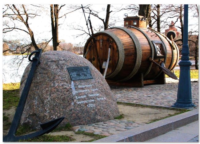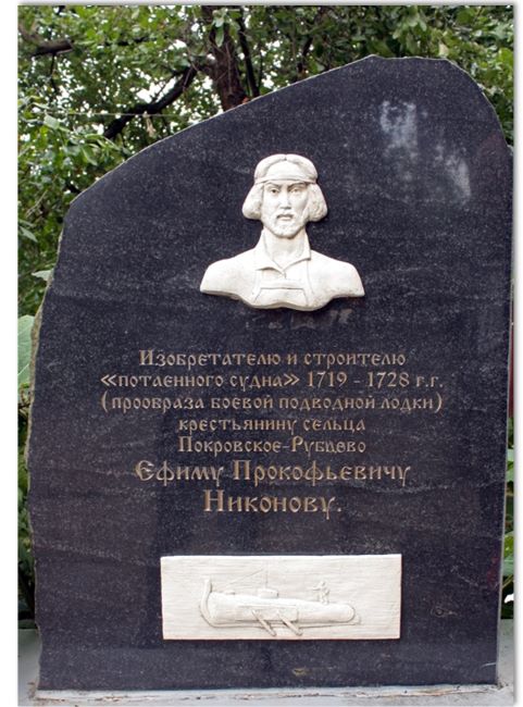 В 1718 году неграмотный крестьянин Ефим Никонов из подмосковного села Покровское, работавший плотником на корабельных верфях, подал челобитную на имя Петра I. В ней он сообщал, что «сделает к военному случаю на неприятелей угодное судно», которое «будет ходить в воде потаённо». В январе 1720 года Петр I велел направить Никонова в Санкт-Петербург. Царь лично беседовал с изобретателем, после чего приказал ему, «таясь от чужого глаза», построить действующую модель подводного судна.
