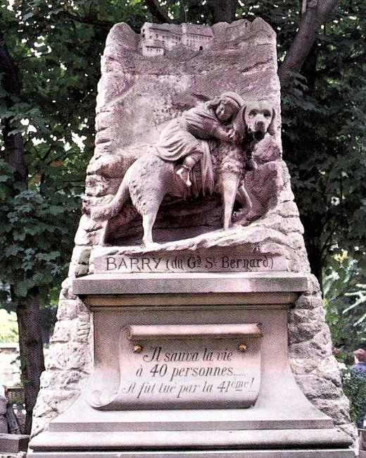В Швейцарских Альпах, где девять месяцев длится зима, почти каждый день выпадает снег, свирепствует холод, лавины не щадят ни людей, ни их жилища. После каждой пурги местные жители разыскивают пострадавших или заблудившихся людей. Им всегда помогают сильные, рослые собаки породы сенбернар, которые отличаются выносливостью и необычайным чутьем. Перед выходом на поиски четвероногим спасателям привязывают на шею пакет с продуктами, пакет вина, а на спину теплое одеяло. Если человек не глубоко засыпан снегом, то сенбернар сам его раскопает. Когда собаке одной это не по силам, она бежит в селение и приводит на помощь людей. Среди собак этой породы были свои знаменитости. Например, пёс по имени Лев смог спасти 35 человек. А псу Барри, спасшему 40 человек, поставили памятник, который возвели в Париже в 1899 году. На каменном постаменте огромный пёс и доверчиво прижавшийся к нему ребёнок. Надпись на постаменте гласит: "Барри, спасшему сорок человек и убитому сорок первым". Памятник Барри – это памятник всем сенбернарам, спасавшим людей.