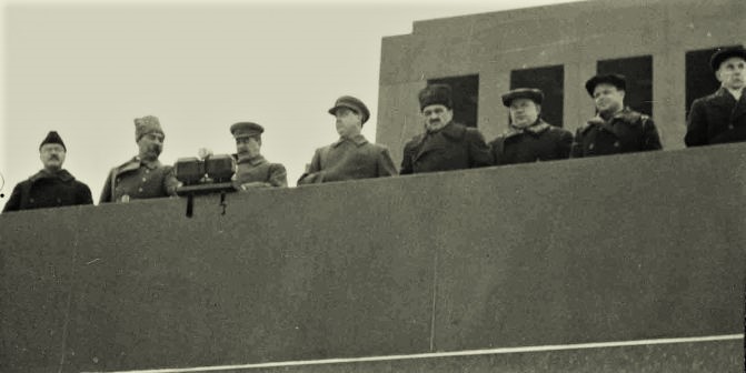 Руководители партии и правительства на трибуне мавзолея Ленина во время военного парада, посвященного празднованию 24-й годовщины Октябрьской революции 7 ноября 1941 года.