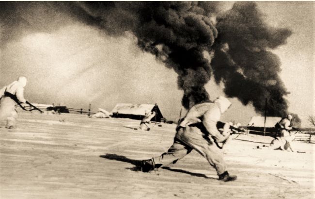 Советский танковый десант Западного фронта при поддержке танка Т-34 атакует занятую противником деревню.