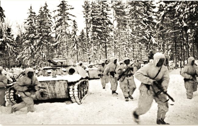 Танковый десант одной из частей 1-й Гвардейской мотострелковой Московской дивизии и колонна легких танков Т-40 в зимнем лесу во время битвы за Москву.