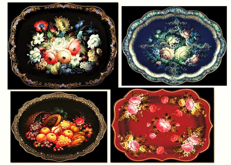 Главная тема украшения жостовских подносов – букеты цветов, гирлянды, своеобразные натюрморты. Большой цветок непременно будет иметь розовый отблеск – это традиция. Роспись выполняют приемами свободного кистевого мазка, без предварительного нанесения рисунка. Чаще всего используется черный фон. Объемы цветов и листьев как бы вырастают из глубины фона. Это делают путем постепенного перехода от темных тонов к светлым. В росписи как будто оживают цветы. За свою историю жостовские подносы из бытового предмета стали самостоятельными декоративными предметами, а ремесло обрело статус уникального вида русского народного искусства.