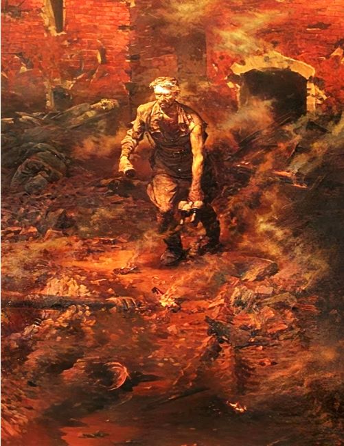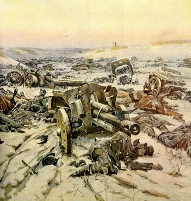 В феврале 1944 года художник становится свидетелем одной из самых значительных операций Красной армии – Корсунь-Шевченковской – на Украине. Здесь была разбита и уничтожена крупная группировка фашистских войск. И в своей композиции «Корсунь-Шевченковское побоище» автор весьма впечатляюще показывает разбросанные на многие километры по заснеженному полю трупы врагов, груды искорёженного, разбитого, обгоревшего металла – то, что осталось от фашистских танков, самолётов, орудий, машин. Это было истинное побоище.