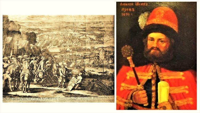 Гравюра А. Шхонебек «Осада Азова в 1696 г.»; первый генералиссимус А. С. Шеин
