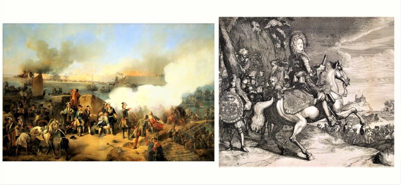 Худ. Александр Коцебу «Штурм крепости Нотебург 11 октября 1702 года», 1846 год; гравюра П. Пикарта «Битва при Калише». 1707 г.