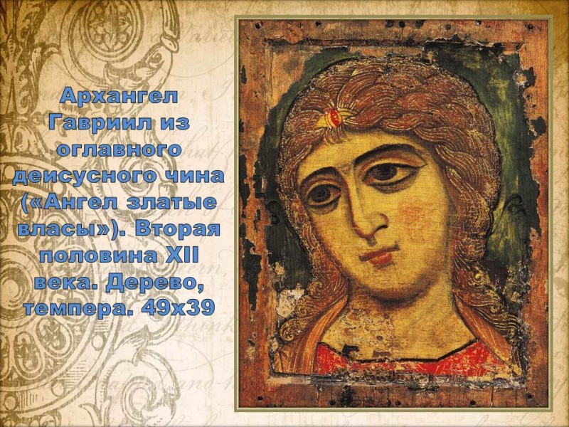 Икона «Ангел златые власы» — истинный шедевр коллекции древнерусской живописи. За небольшой период времени русские иконописцы едва ли могли добиться такой тонкости в исполнении образа, а миндалевидный разрез глаз архангела, нехарактерный для жителей Древней Руси, подтверждает предположение и выдает руку греческого мастера. Чуть повернутый в сторону лик указывает на то, что изображение предназначено для иконостаса, в котором, согласно правилу изображения и размещения святых, все персонажи должны быть обращены к центральному образу — Спасу Вседержителю.