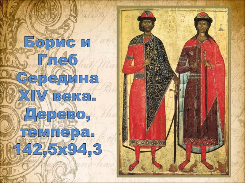 Облаченные в богатые одежды, в княжьих шапках с меховой опушкой братья-мученики представляют собой образ первых русских святых. Летописи подробно повествуют об их трагической гибели в 1015 году. После смерти великого князя Владимира престол захватил один из его сыновей — Святополк. Желая избавиться от конкурентов на царствование, он решил хитростью убить братьев. Борис и Глеб, не пожелавшие участвовать в братоубийственной усобице, покорно приняли смерть. Последними словами Бориса, старшего по возрасту и изображенного с небольшой бородкой, были: «Как Господу угодно — так и будет».