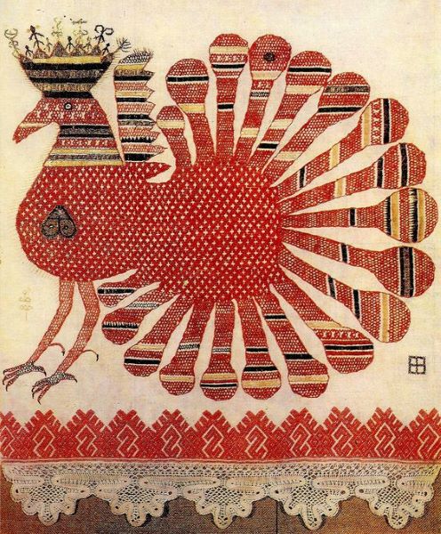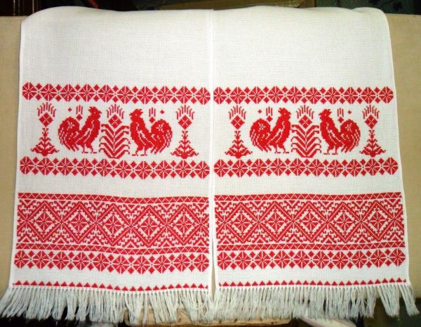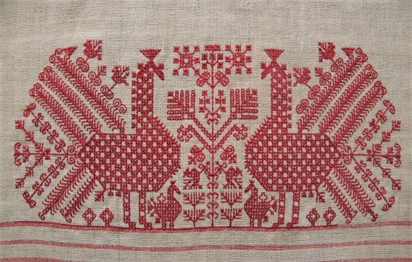 Птица – один из самых распространенных образов русского народного искусства. На вышивках она чаще всего включается в общую композицию с женской фигурой или деревом. Это знак воскрешения природы, пробуждения земли. Птицы– символизировали свет, тепло, весну, счастье. Например, Петух символ богатства, мужского здоровья, человеческого благополучия. Очень часто петухов вышивали на рушниках для молодоженов. Обе матери этим желали молодым здоровья, счастья, процветания. Две птицы голова к голове – символ счастливого брака, поэтому этот сюжет часто используют в ритуальной женской одежде. Птицы на полотенце – знак памяти об усопших, символ души, вестники иного мира, они же – знак хорошего урожая.