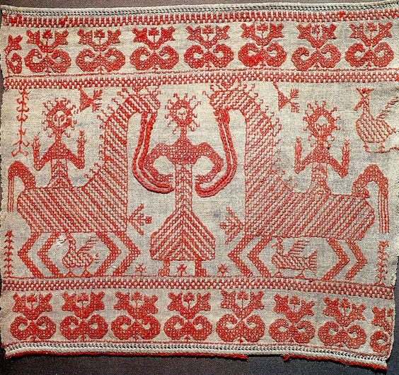 Один из распространенных сюжетов вышивки – трехчастная композиция расположения женских фигур. Она имеет два основных варианта. На одних вышивках персонажи поднимают руки к небу, на других подчёркнуто опускают руки к земле. Поднятые вверх руки персонажей вышивки несут «идею встречи» небесной благодати. Опущенные вниз руки центральной фигуры вышивки обращены к земле, дающей урожай. Такая последовательность повторов фигуры женщины напоминает многократную молитву на урожай.
