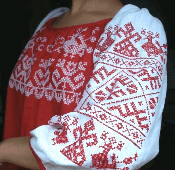 Исследователи видят в сюжетах вышивки отражение древнего земледельческого культа славян. Отсюда графическое изображение явлений, связанных с земледелием. Зубчатая или более плавная волнистая линия в вышивках нередко является графическим изображением воды. По ней плывут ладьи, птицы. Иногда эта линия проходит под чертой, символизирующей почву, на которой растут кусты, трава, располагаются птицы и животные. Вертикальная волнистая линия — это дождь.