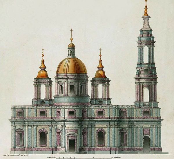 | Исаакиевская церковь петровских времен. Гравюра 1710 г. | Н. Ф. Гербель «Южный фасад церкви Исаакия Далматского». 1721 | Проект Исаакиевского собора архитектора Ринальди. |