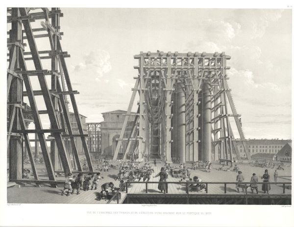 Заготовленные гранитные блоки колонн скатывали на берег и грузили на баржу. Баржа буксировалась двумя пароходами до пристани на Неве. Колонны выгружали и перевозили на строительную площадку для окончательной обработки и полировки. Выгрузка колонн, предназначавшихся для портиков собора, была одним из важнейших эпизодов строительства и явилась впечатляющим зрелищем. Публика не представляла себе, как можно выполнить эту перевозку. Оригинальная система устройства лесов давала возможность 128 рабочим поднимать колонну высотой 17 метров за 40 – 45 минут. Подобного строительная техника до той поры не знала. Декабрист Н. А. Бестужев, талантливый публицист и живописец, в одной из своих корреспонденций критиковал издателей газет и журналов за то, что в русской печати мало отражен этот народный подвиг. «Мы ищем, - писал он, - удивительных вещей в чужих краях, с жадностью читаем древние истории, повествующие нам об исполинских подвигах тогдашней архитектуры, за каждой строчкой восклицаем: чудо! Неимоверно!.. И проходим мимо сих чудных, неимоверных колонн с самым обыкновенным любопытством… Огромность колонн, простые способы, которые по секрету открыла сама природа нашим простым людям… всё оное… наполняет мою душу каким-то приятным чувством, от которого мне кажется, будто я, россиянин, вырос целым вершком выше иностранцев…»