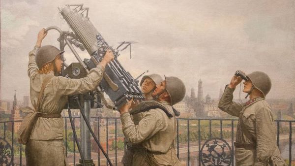 | Г. Нисский «На защиту Москвы». 1942 | В. Журавлев «Московские зенитчики». 1942 |