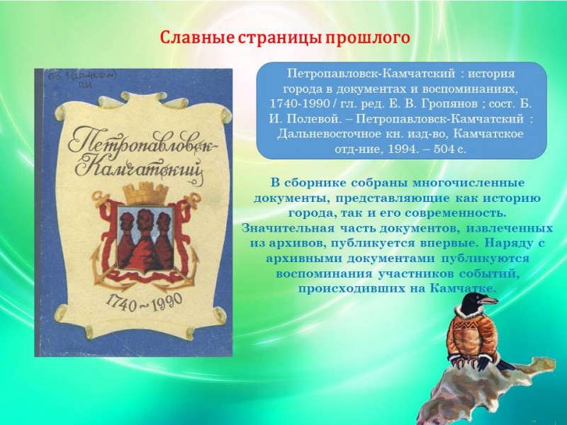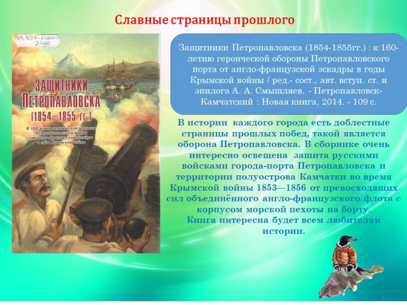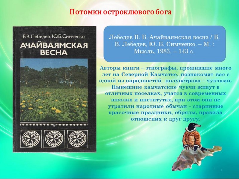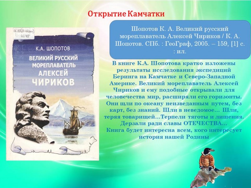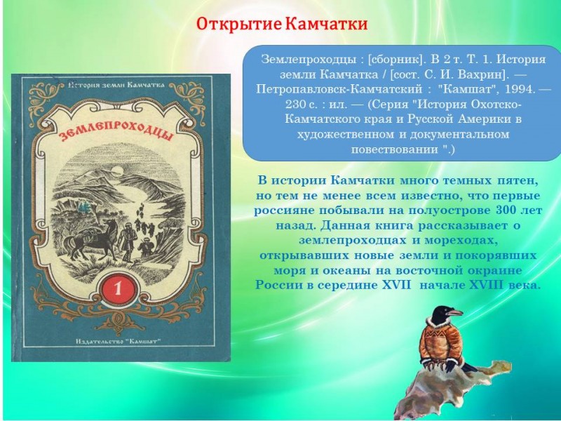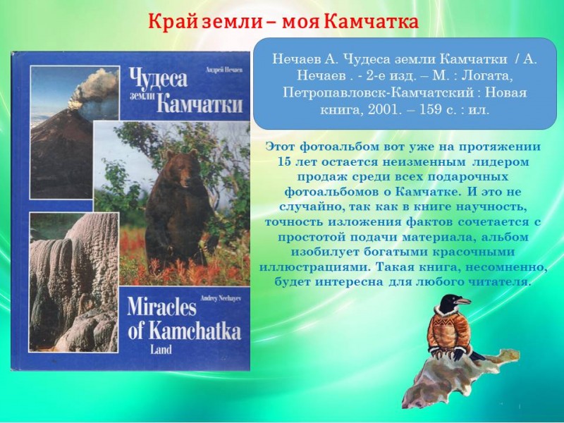 На Камчатке можно увидеть удивительные снежные вершины, чистейшие высокогорные озера, кипящие рыбой бурные реки, уникальные природные парки и заповедники, горячие источники и гейзеры. Не удивительно, что , несмотря на свою удаленность Камчатка влечет к себе туристов. Почувствовать харизму Камчатского края, его величие и притягательность можно,побывав здесь и прочитав книги о полуострове.