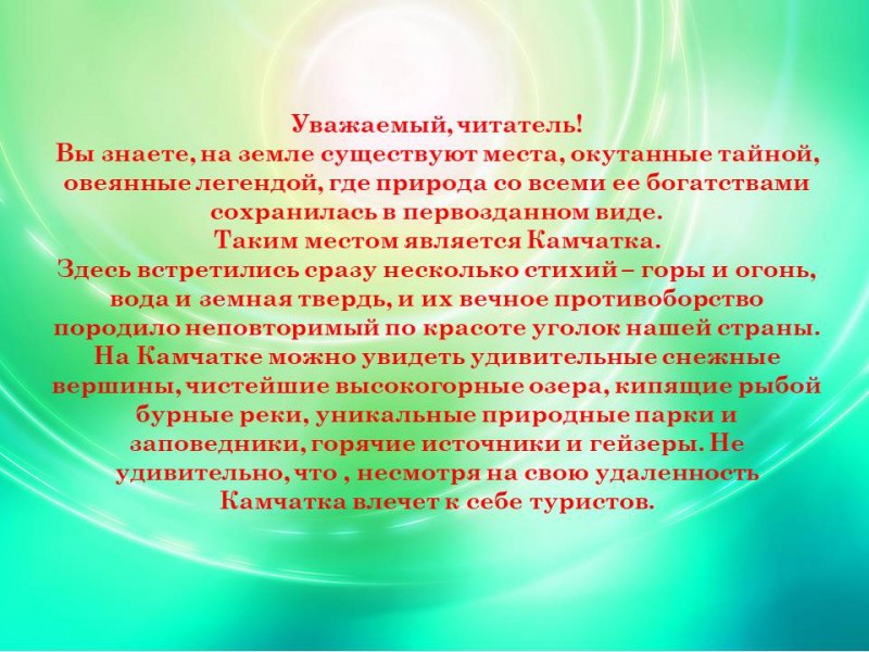 Вы знаете, на земле существуют места, окутанные тайной, овеянные легендой, где природа со всеми ее богатствами сохранилась в первозданном виде.Таким местом является Камчатка.