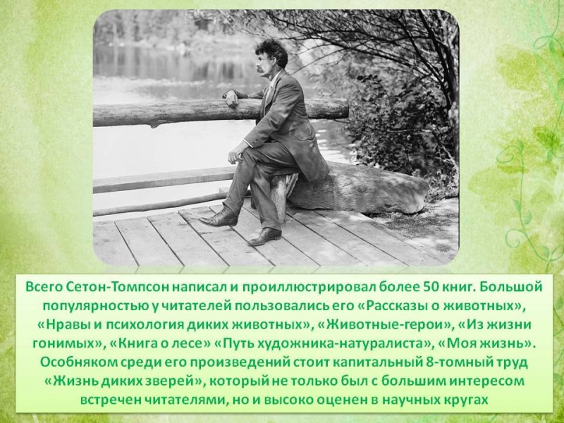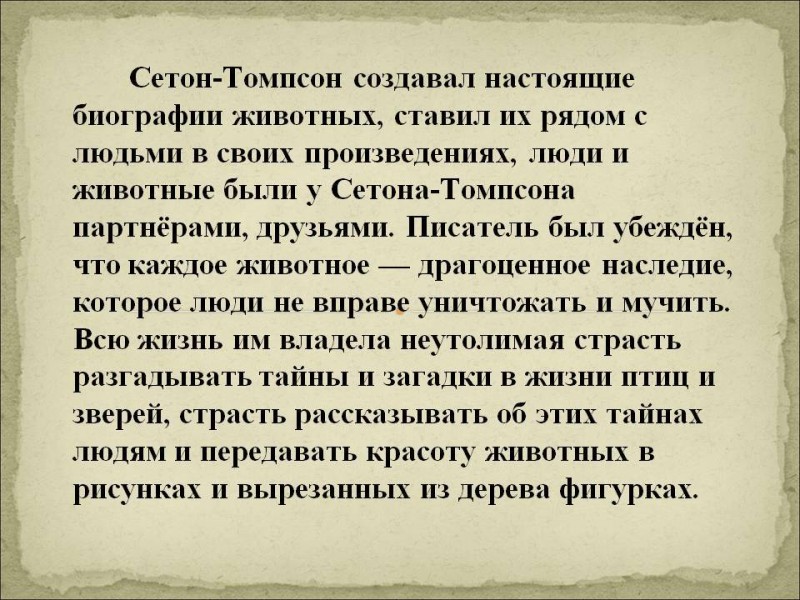 Сетон-Томпсон чрезвычайно правдиво и точно описывал действия, поступки и повадки животных. Нет отступления от жизненной правды в том, что птицы и звери как-то по-своему любят и ненавидят, и иногда с необычайной силой, что преданность их доходит до самопожертвования. Нет другого такого писателя, который бы так увлекал школьника любовью к животным, пробуждал бы страстный интерес к ним читателей во всех странах.