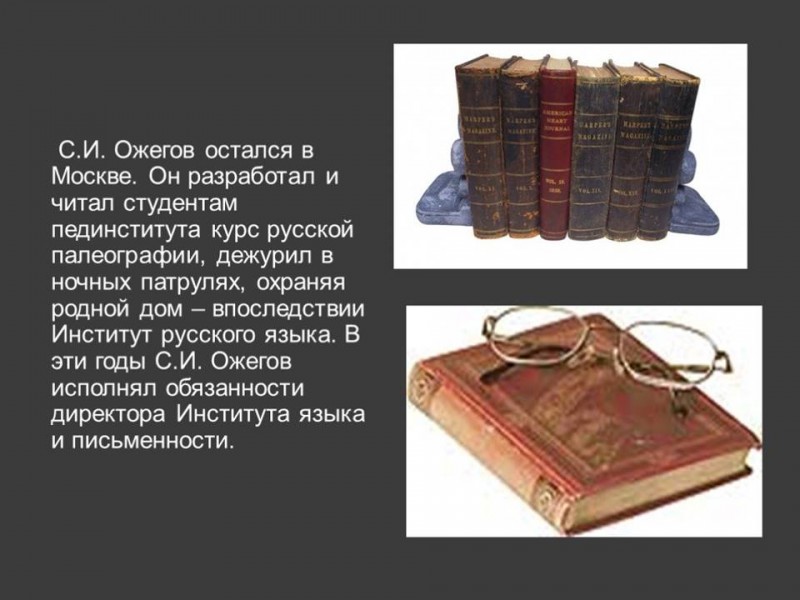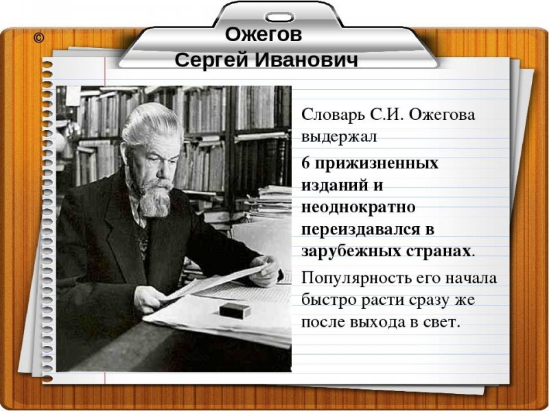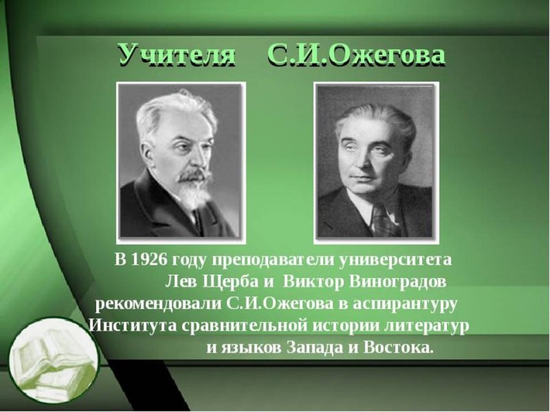 С конца 20-х годов Сергей Ожегов начал работать над «Толковым словарем русского языка», редактором которого был Дмитрий Ушаков. Первый том вышел в 1935, а четвертый - в 1940 году.