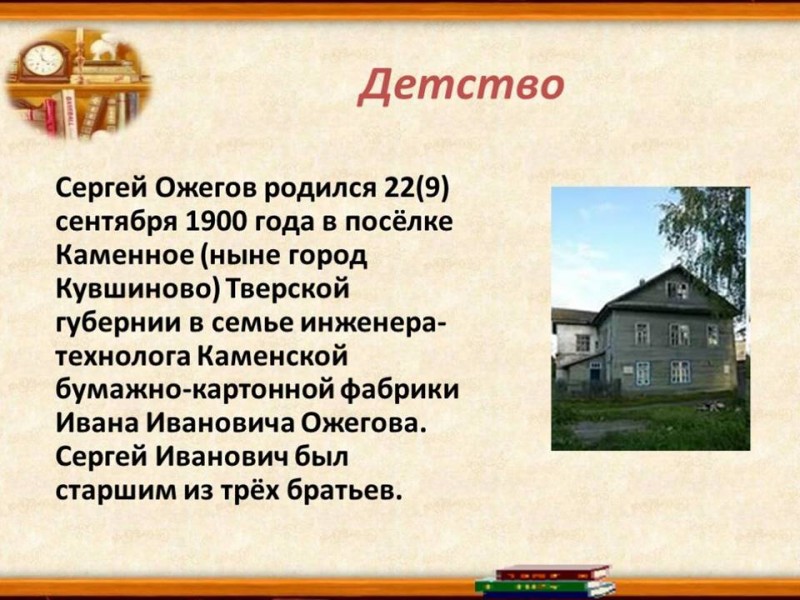 Сергей Иванович Ожегов родился 22 сентября 1900 года в Тверской губернии. Его отец работал инженером на бумажной фабрике, мать была акушеркой в фабричной больнице. Она приходилась внучатой племянницей известному филологу и профессору Петербургского университета Герасиму Петровичу Павскому.