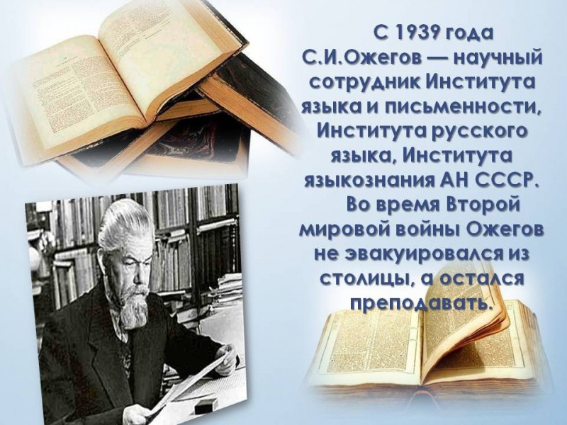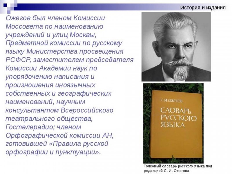 Сергей Иванович Ожегов был членом Комиссии Моссовета по наименованию учреждений и улиц Москвы, и научным консультантом Всероссийского театрального общества.