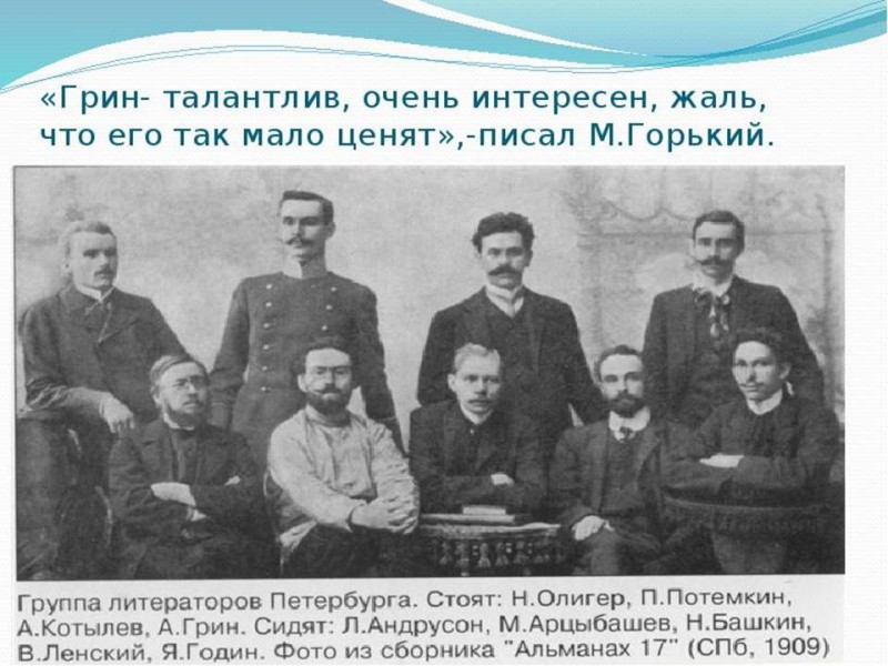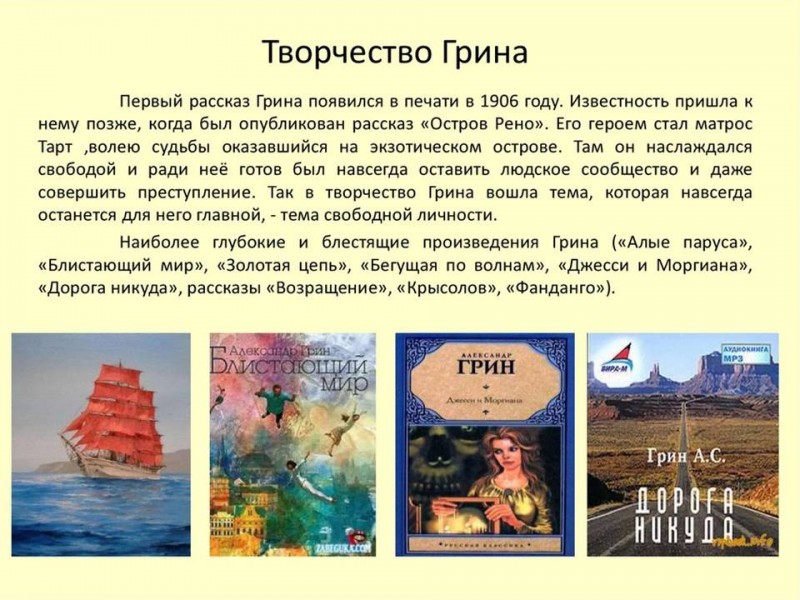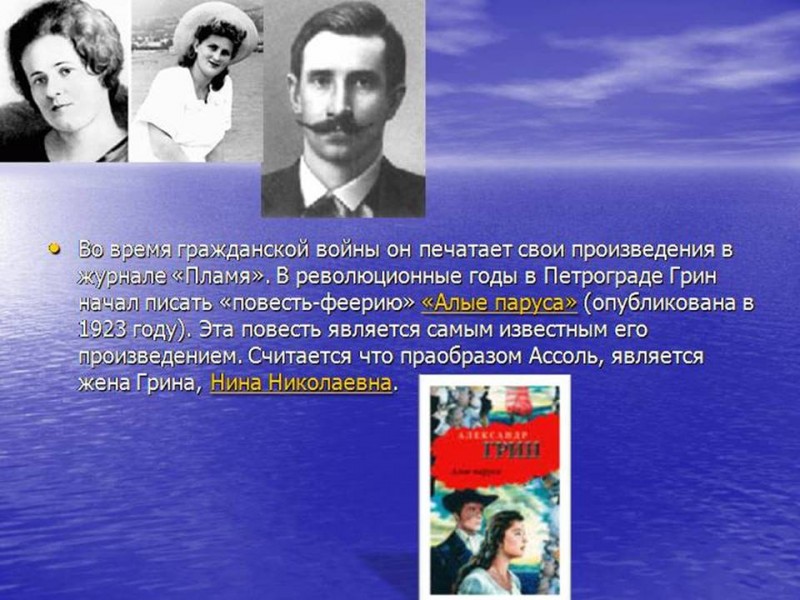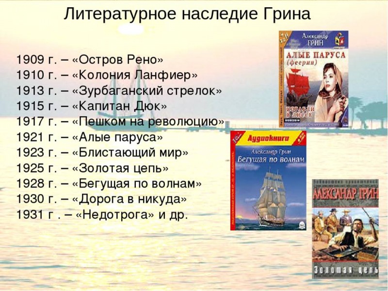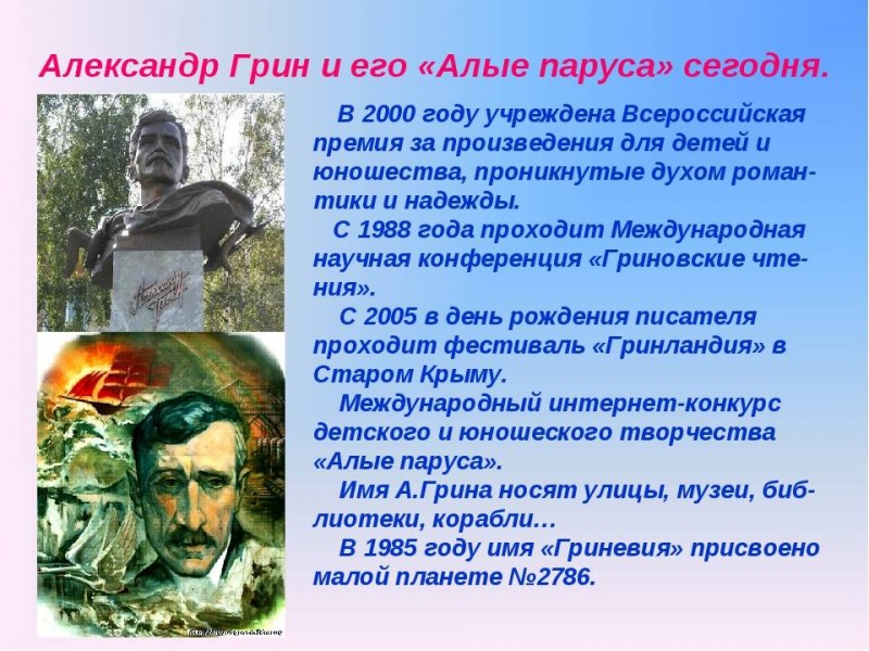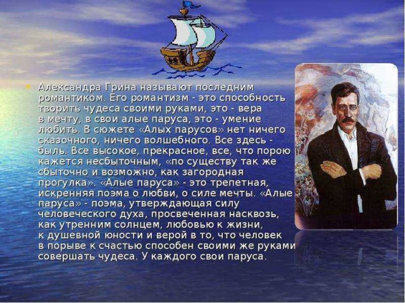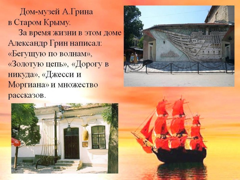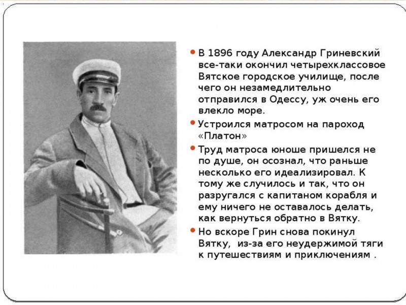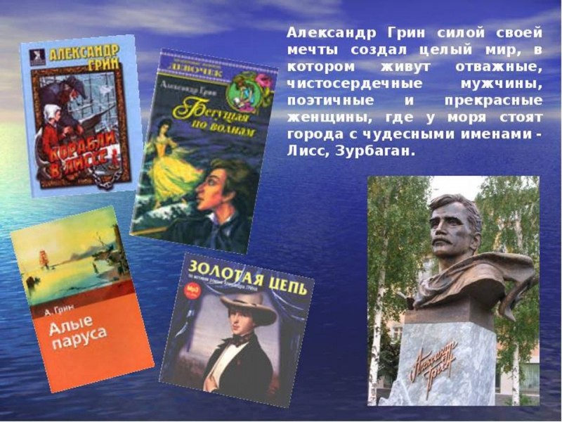 Будущий писатель рос мечтательным и рассеянным мальчиком. Учился он плохо, но запоем читал Майн Рида, Жюля Верна, Густава Эмара и Жаколио. Когда мать умерла, отец женился снова, родился ребенок. Семье Грин был в тягость. Отец раздобыл ему 25 рублей и с мечтой о морской службе Александр Грин отправился в Одессу. Там произошла первая встреча с морем – тем морем, что залило потом ослепительным светом страницы его рассказов.