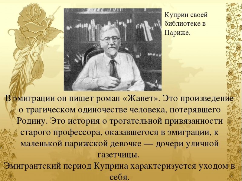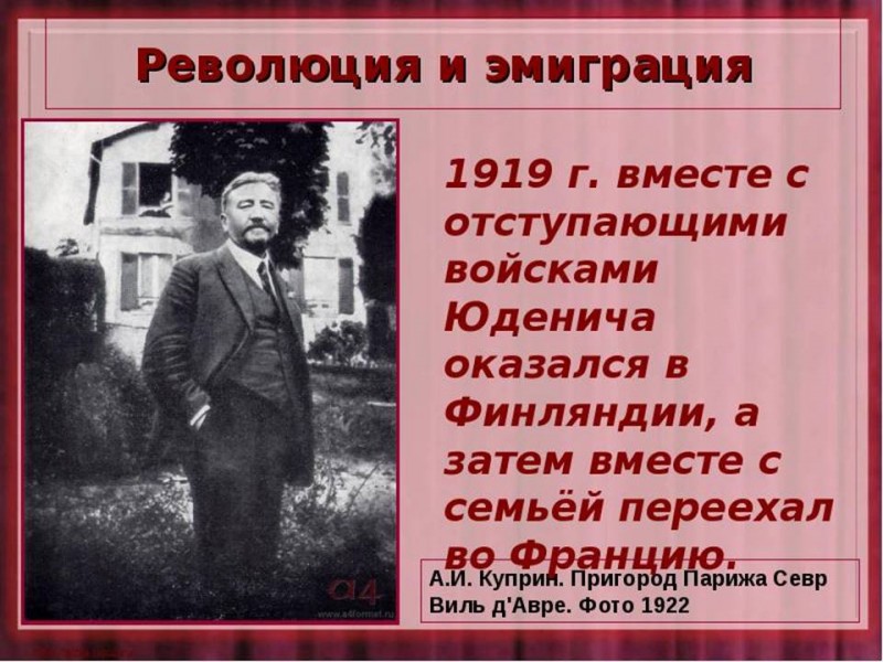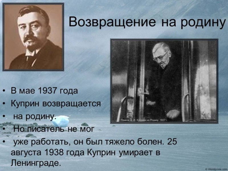 Куприн с восторгом принял февральскую революцию, но сомневался в подлинно народной сущности Октябрьской. В 1919 году он эмигрировал во Францию. За границей он тяжело тосковал по России, почти бросил писать и, наконец, весной 1937 года вернулся в родную Москву. Он был тяжело болен и умер 25 августа 1938 года. «Даже цветы на родине пахнут по-иному», - написал он перед самой смертью, и в этих словах выразилась вся его глубочайшая любовь к своей стране.