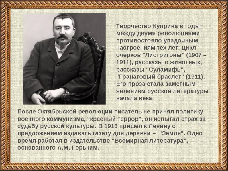 У Куприна есть много тонких произведений о любви, ее ожидании и трагических исходах. Он не извлекал свои рассказы из мира вымысла. Так, все персонажи «Гранатового браслета» действительно существовали. Это печальная история маленького телеграфного чиновника Петра Петровича Жолтикова. Куприн всегда и всюду благословлял любовь. Особую силу «Гранатовому браслету» придает то, что в нем любовь существует как неожиданный подарок, среди обыденщины и трезвой реальности.